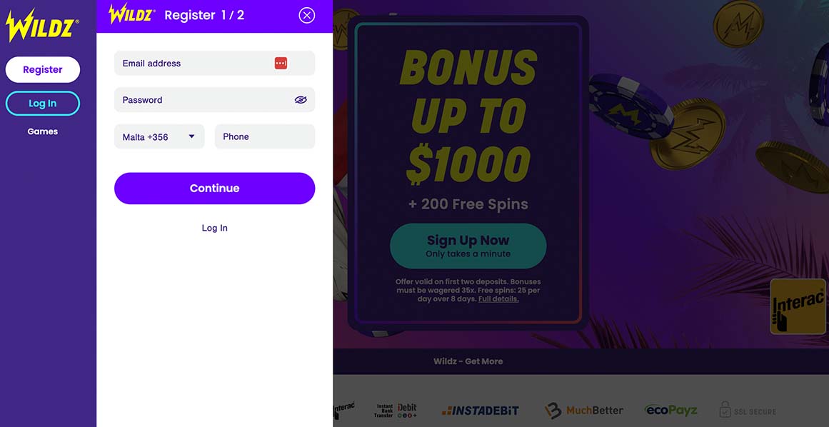 Canadian players will find Wildz’s signup process refreshingly straightforward. Simply hit that prominent green button at the top right, follow the easy steps, and you're on your way to a Wildz account in no time!